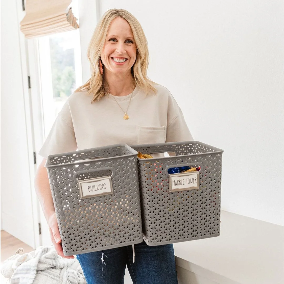 Use low, open bins that they can reach on their own. I like these bins that make play time and clean up a breeze!